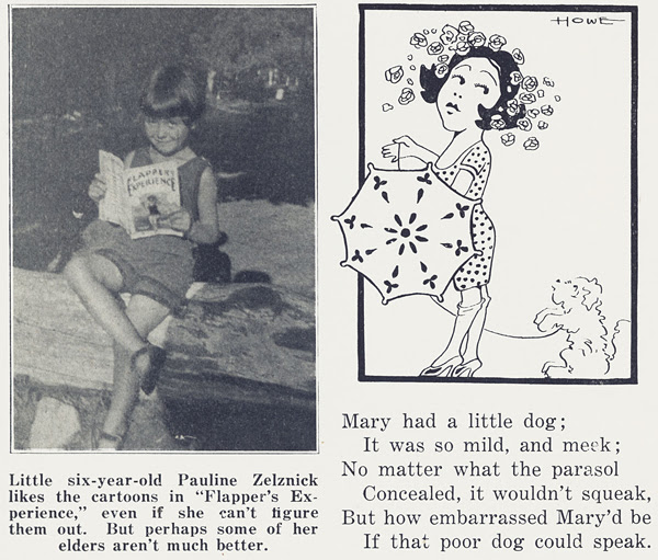 I'll lead with one of the many photos from the magazine, much better printed than the few in the first issue I shared. A flapper-to-be? Pauline Zelznick, next to one of those puzzling cartoons.