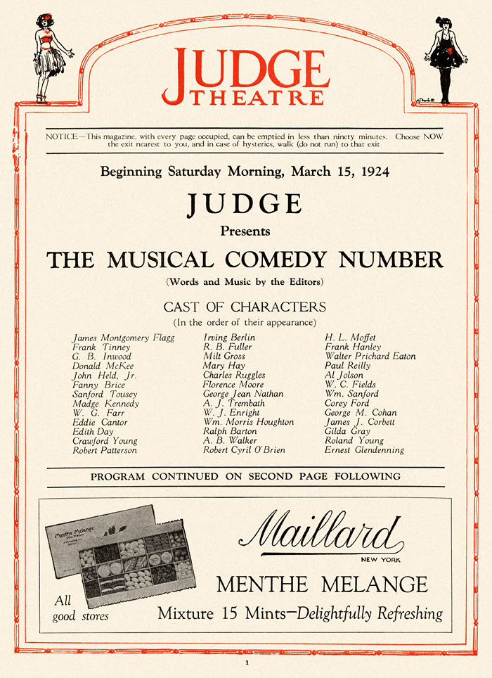 Aloha, scanlovers, hot off the press, a hula-dancing beauty painted by Sam Brown shimmies across a cover here at Darwin's digital newsstand today on a classic issue of Judge, a long-running humor magazine that had a fertile period in the 20s and featured many of the great artists and writers of the day. Published by the Leslie-Judge company, Judge had outlasted its progenitor, Puck, and had moved away from scathing political satire towards maybe something more similar to the first incarnation of Life magazine. I haven't researched any numbers regarding circulation in the 20s, but, judging from the number of existing issues I see on eBay, I think it sold fairly well. Jack over on the Enoch Bolles writes that Judge was a sinking ship and had trouble paying its contributors, but I think that regardless of how they paid the help (stiffing writers and artists and juggling debts was simply a way of doing business for some unscrupulous publishers and editors), Judge still managed to publish and move a lot of copies of an excellent mag. But enough of these generalities - on with the show! This Musical Comedy Number features many great artists like James Montgomery Flagg, Milt Gross, Robert Patterson, John Held, Jr., and Ralph Barton and as well as other figures from the worlds of comedy, music, and literature such as George M. Cohan, Irving Berlin, W.C. Fields, Al Jolsen, and Fanny Brice.
